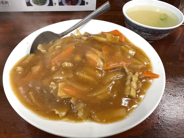 トロミがとても強い餡は私の好みの濃いめの鶏がら醤油味で、とんかつとご飯に絡みまくってめちゃくちゃ旨い!