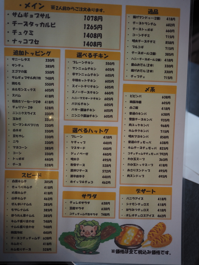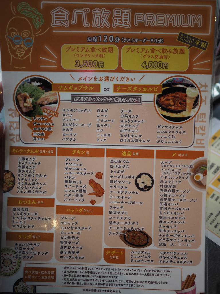 いずれも「サムギョプサル」か「チーズタッカルビ」の食べ放題のどちらかを選び、それ以外の料理も全て食べ放題になります。