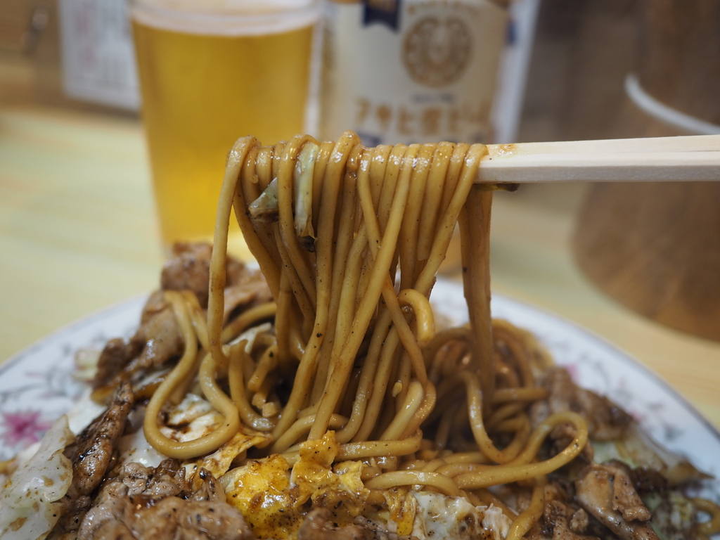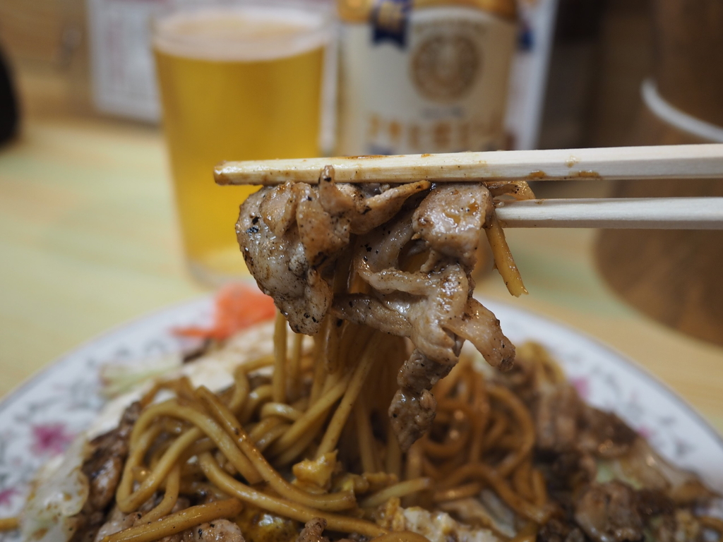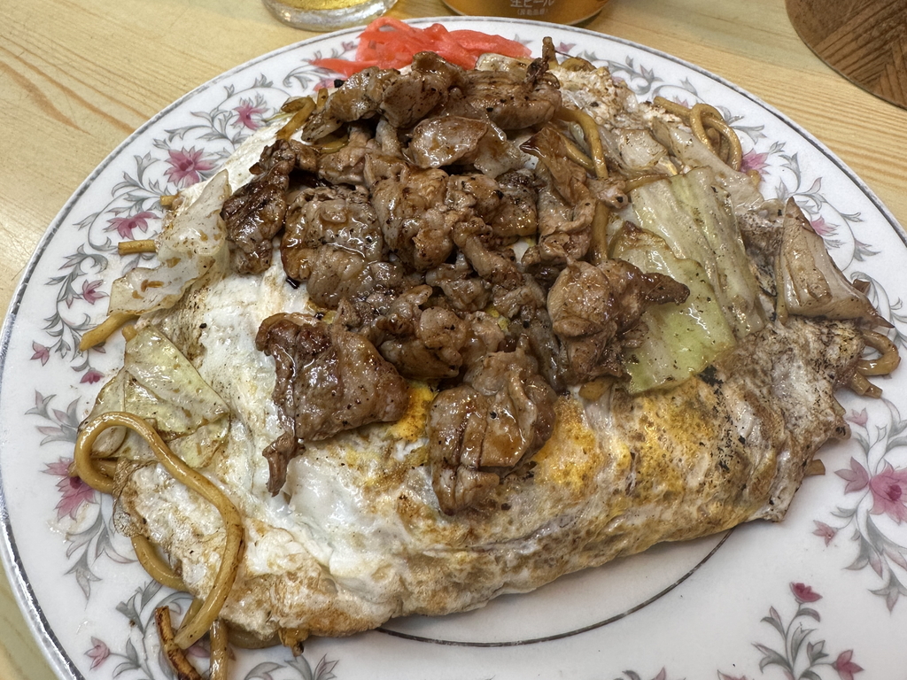 薄焼き卵に包まれた焼きそばに豚肉がたっぷり乗ってこのボリュームでたった550円は素晴らしく良心的です!