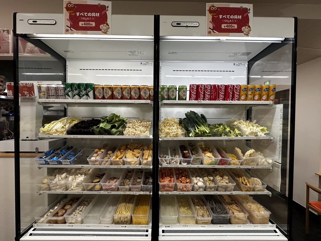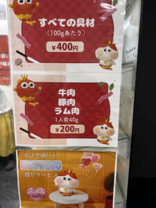 ズラリと並んだ具材や麺は100g400円です。