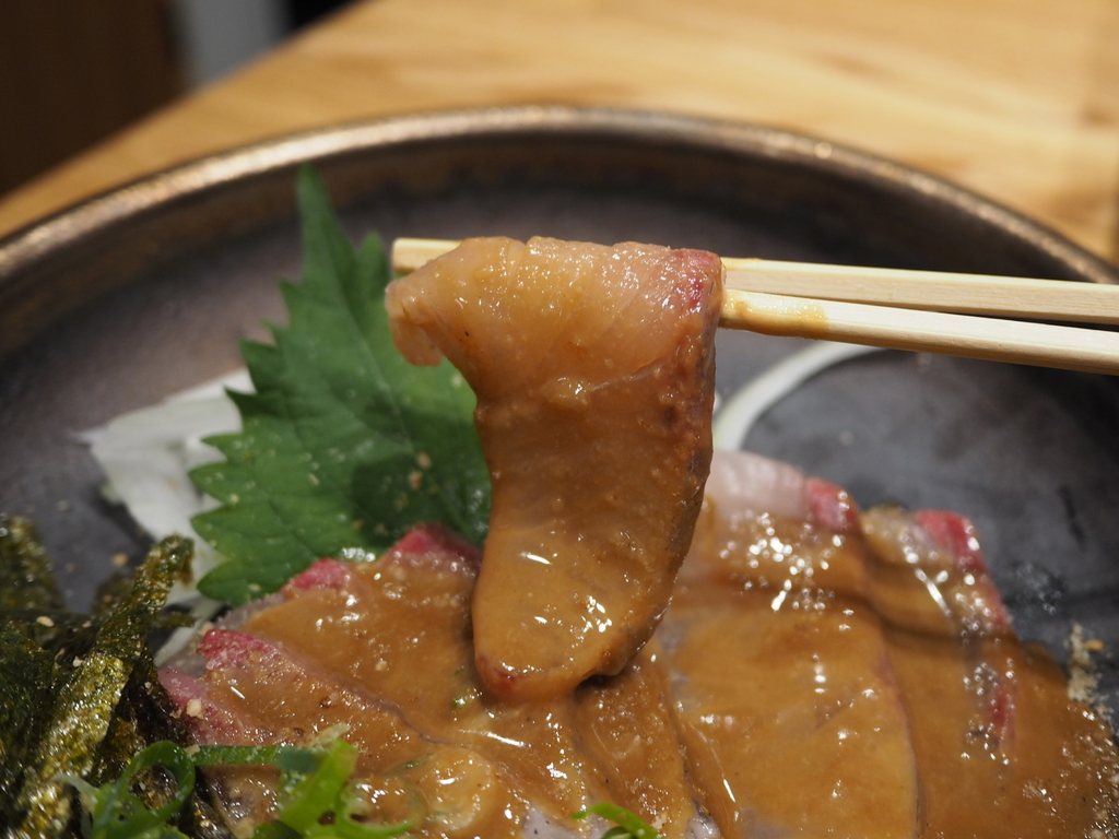脂の乗った甘いカンパチに濃厚なゴマダレが絡んでめちゃくちゃ旨い!