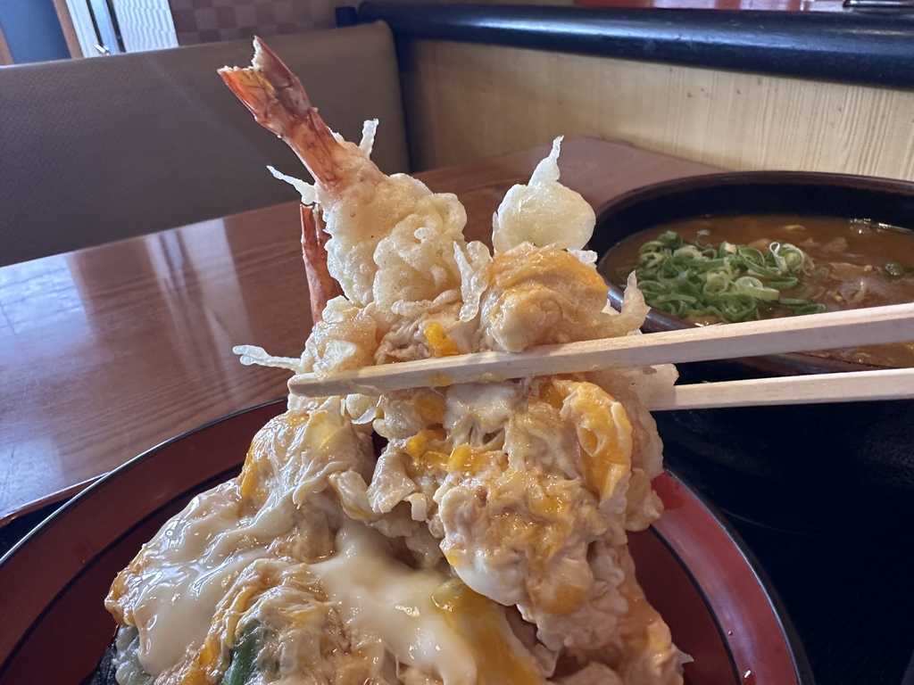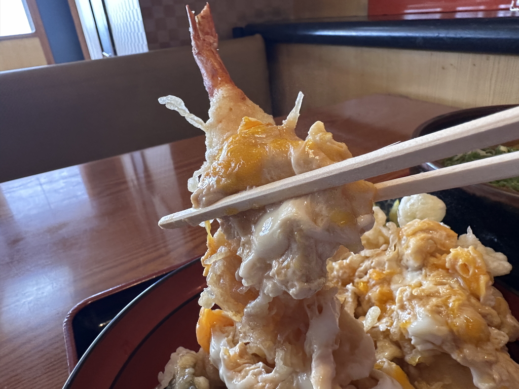 プリプリの海老天にトロトロのお出汁の効いた玉子が絡んでめちゃくちゃ旨い!