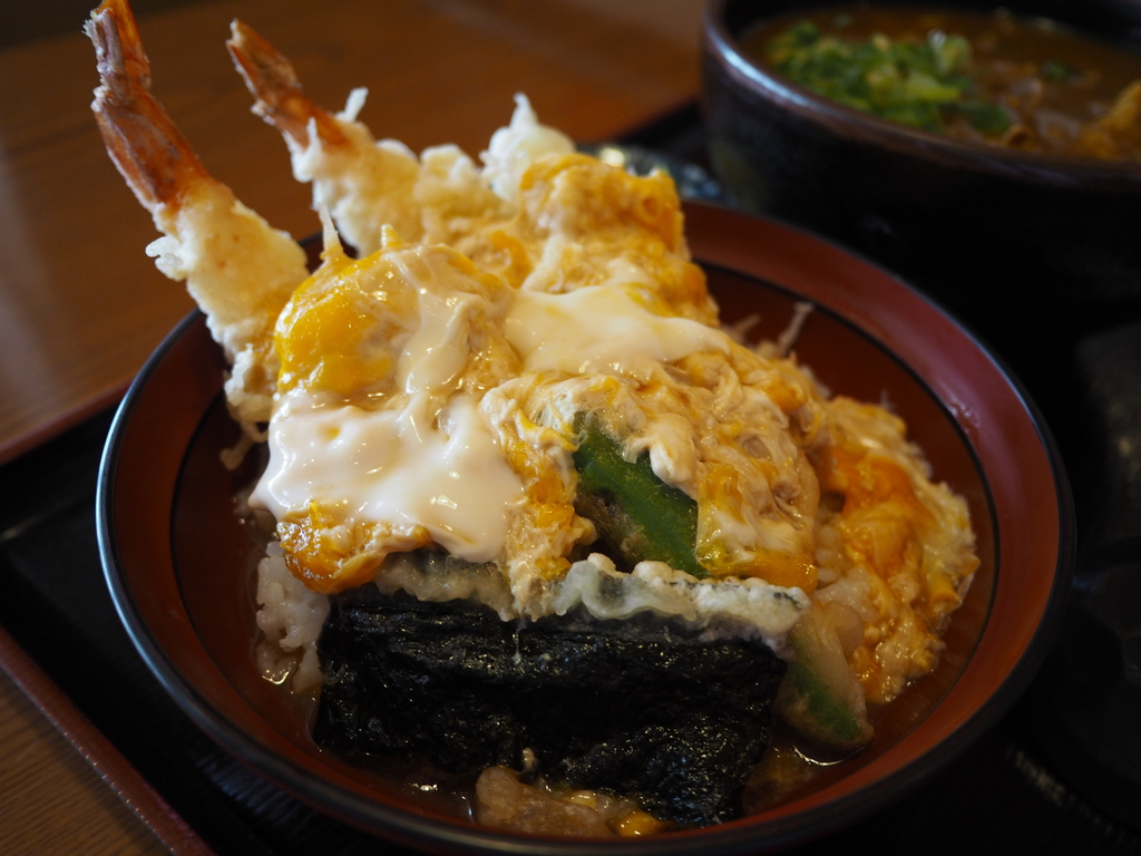 大きな海老天が2尾も乗った豪華な天とじ丼!