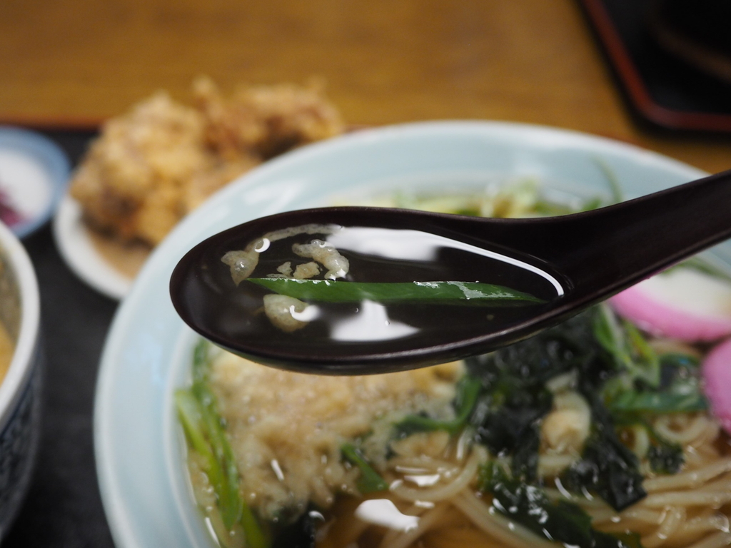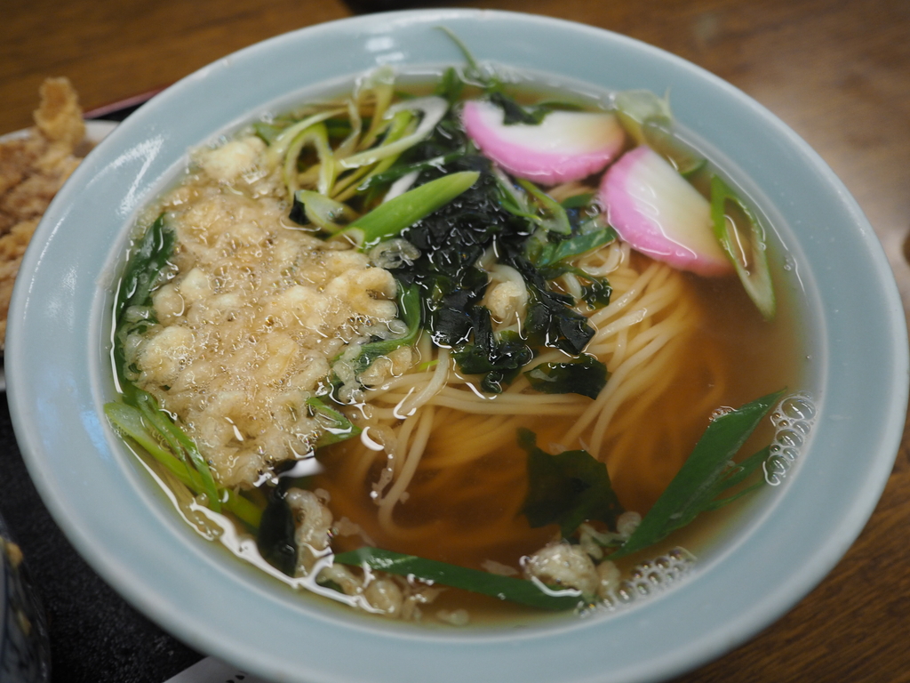 トッピングは天かす、ネギ、わかめ、かまぼことシンプルです。