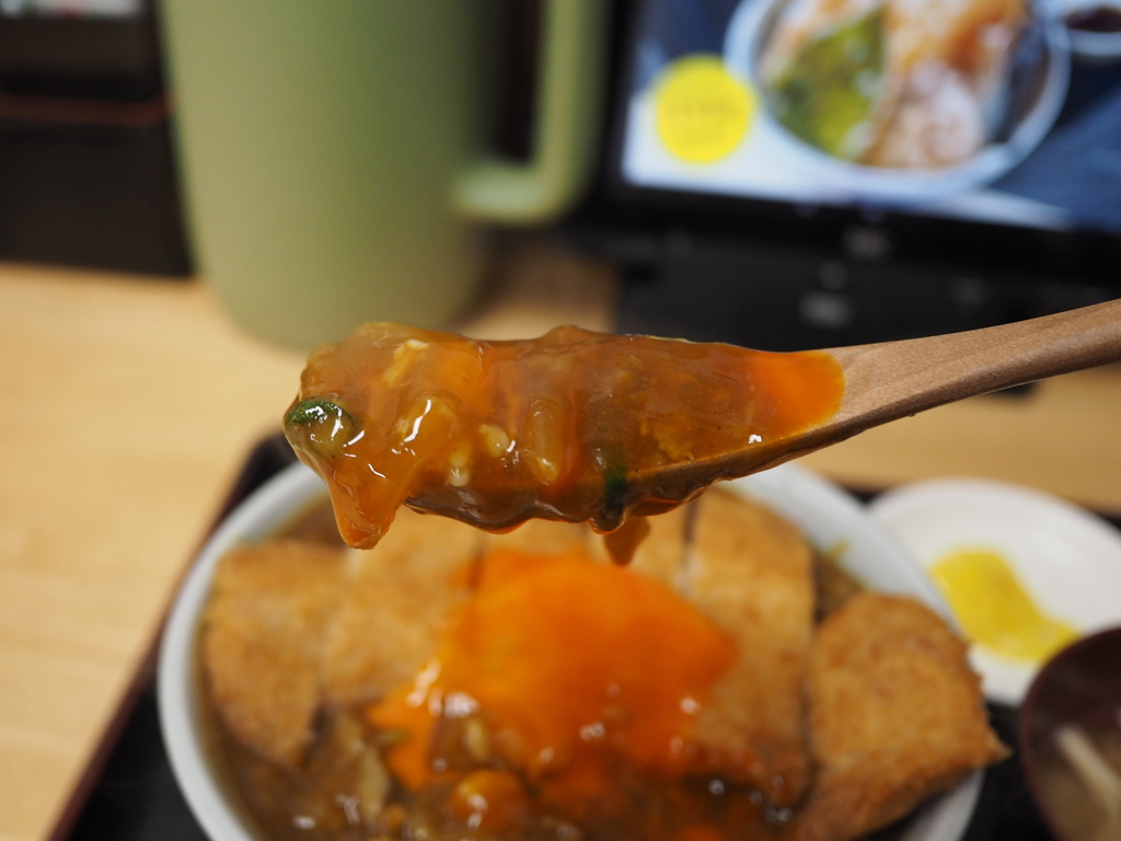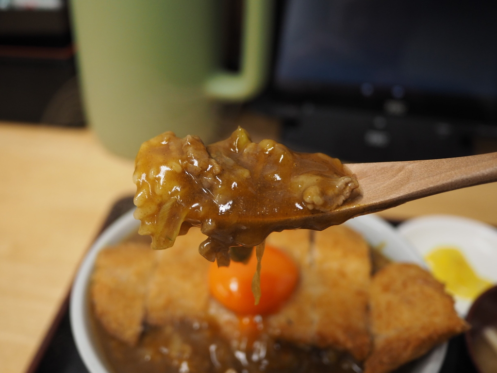とんかつが甘くてジューシーでこれだけでめちゃくちゃ美味しくて、お出汁が効いたカレーが絡んだらさらにより一層旨い!