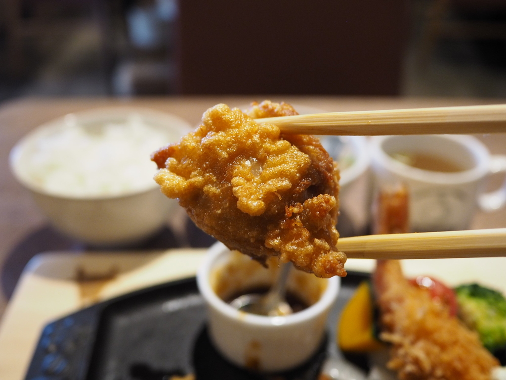 衣はふわっと柔らかいタイプの唐揚げは、身がプリプリでジューシーでしっかり下味が付いて旨い!