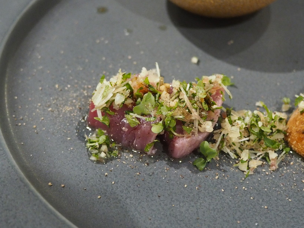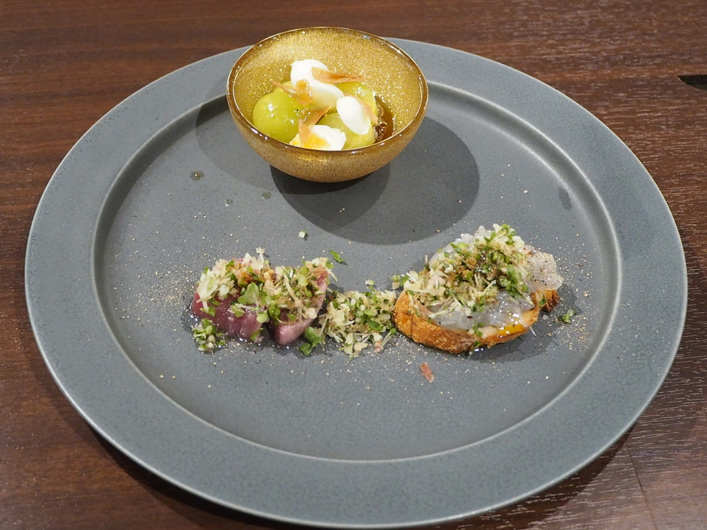 マスカットと時王のサラダ、長崎県産天然スマカツオ和風カルパッチョ、三重県産シラスブルスケッタ