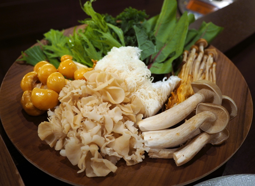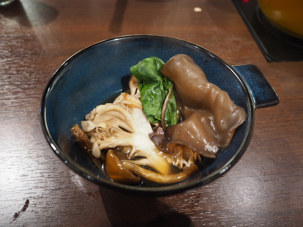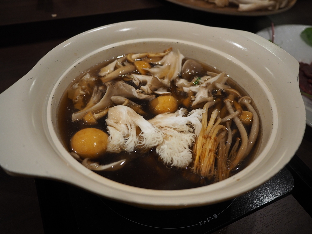 国産ダチョウフィレ肉、京水菜、ケール、赤軸ほうれん草、生きくらげ、ブラウンエノキ、山伏茸、なめ茸、花びら茸、一株舞茸ととても豪華なお鍋です!
