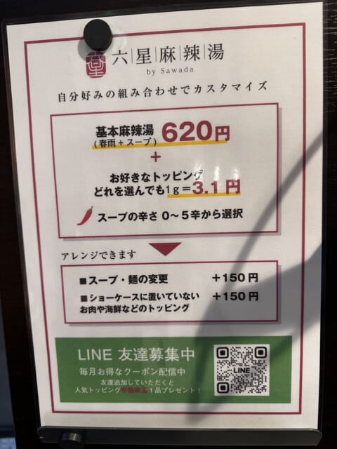 システムは、基本となる麻辣湯は春雨が入ったスープが620円税込となり、そこにトッピングを追加していきます。