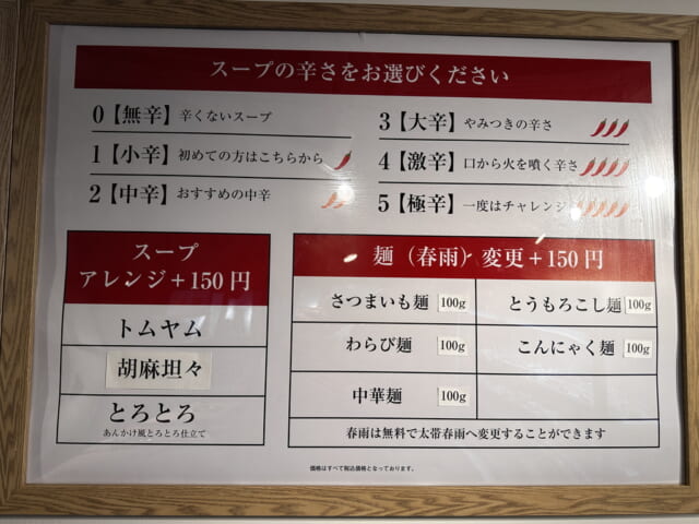 基本となる春雨は細麺か太麺かを選べるので太麺で、辛さは「2辛」を選択!