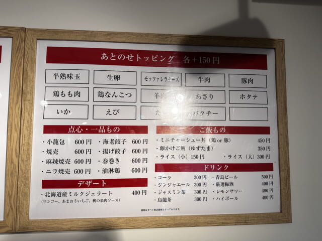 オプションでスープや麺の変更とショーケースに置いていないトッピングが+150円税込で用意されています。