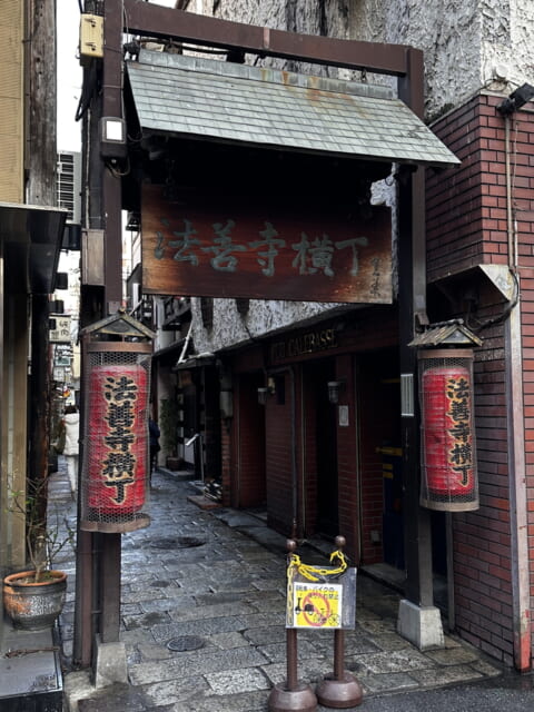 難波にある「法善寺横丁」には、風情溢れる石畳の通りの両側にたくさんの飲食店が立ち並びます。
