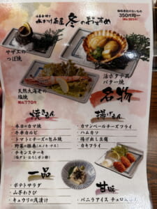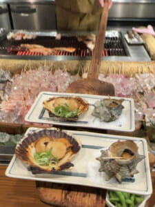サザエのつぼ焼き」(385円税込)、「活ホタテ貝バター焼」(385円税込)、