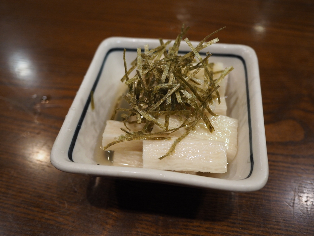 注文をしていないのに自動的に出てくる「つきだし」ですが、これがあるからこそこちらのお店はクオリティーの高い料理をお安くご提供いただけるので、喜んでいただきましょう(^^