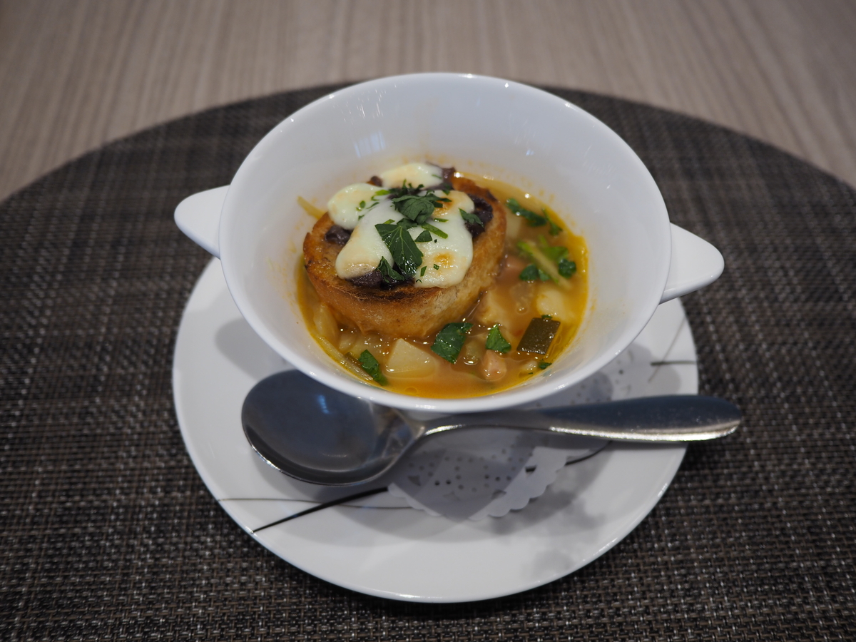 「野菜と大豆ミートのミネストローネ 燻製チーズのブルスケッタ添え」