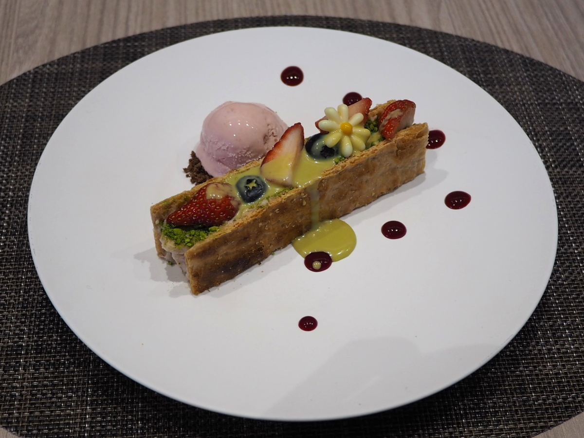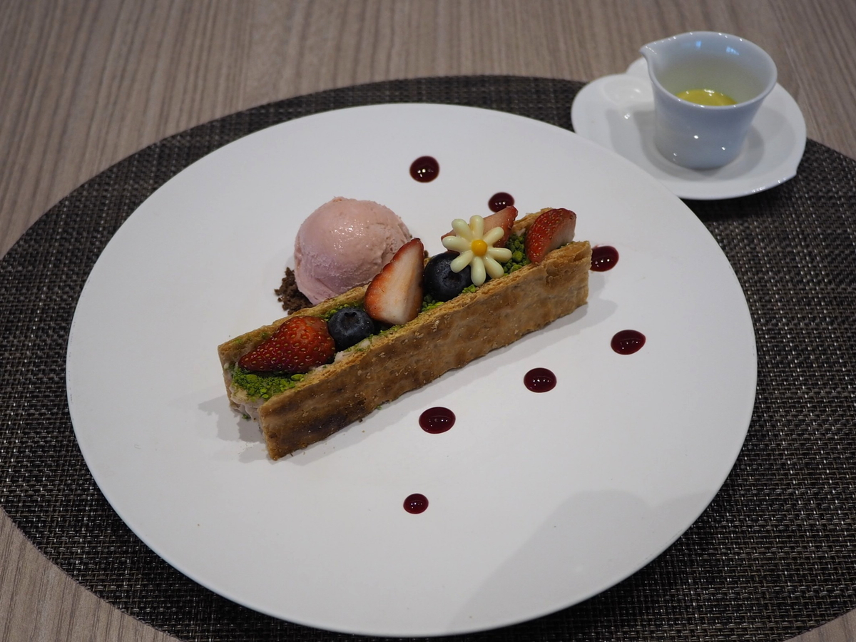 オプション苺スイーツ「苺のミルフィーユ ピスタチオソース」(+700円税込、アンケートに答えると+500円税込)
