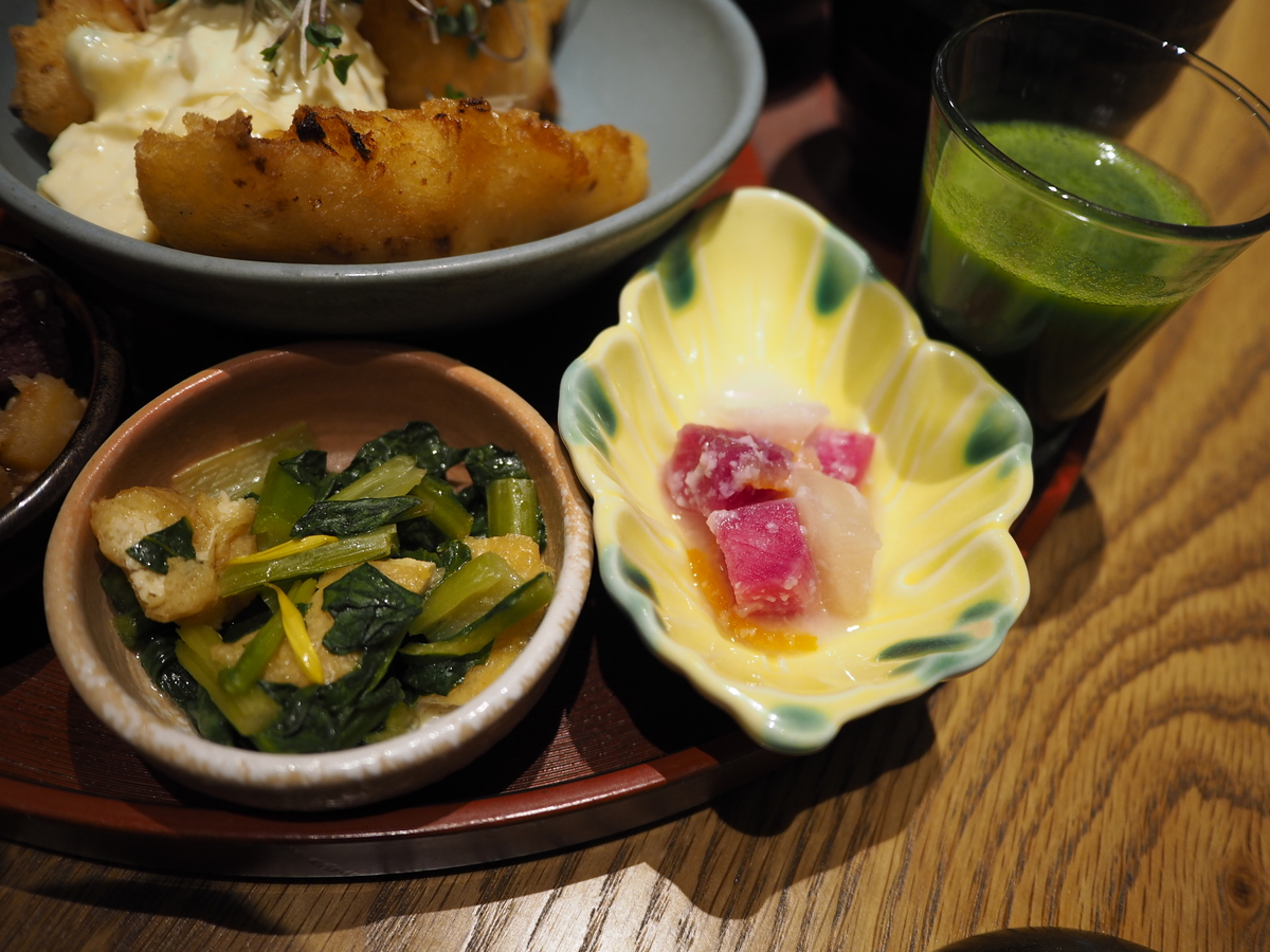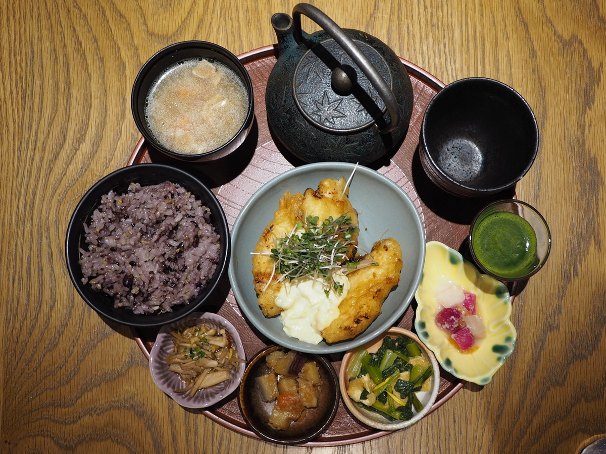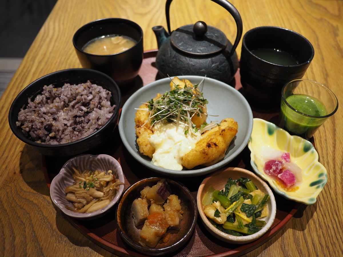 メインのチキン南蛮に副菜4種、十八穀米ご飯、豚汁、グリーンジュース、南部鉄瓶茶が付いてとても豪華です!