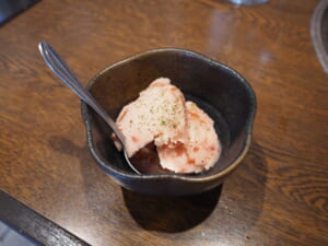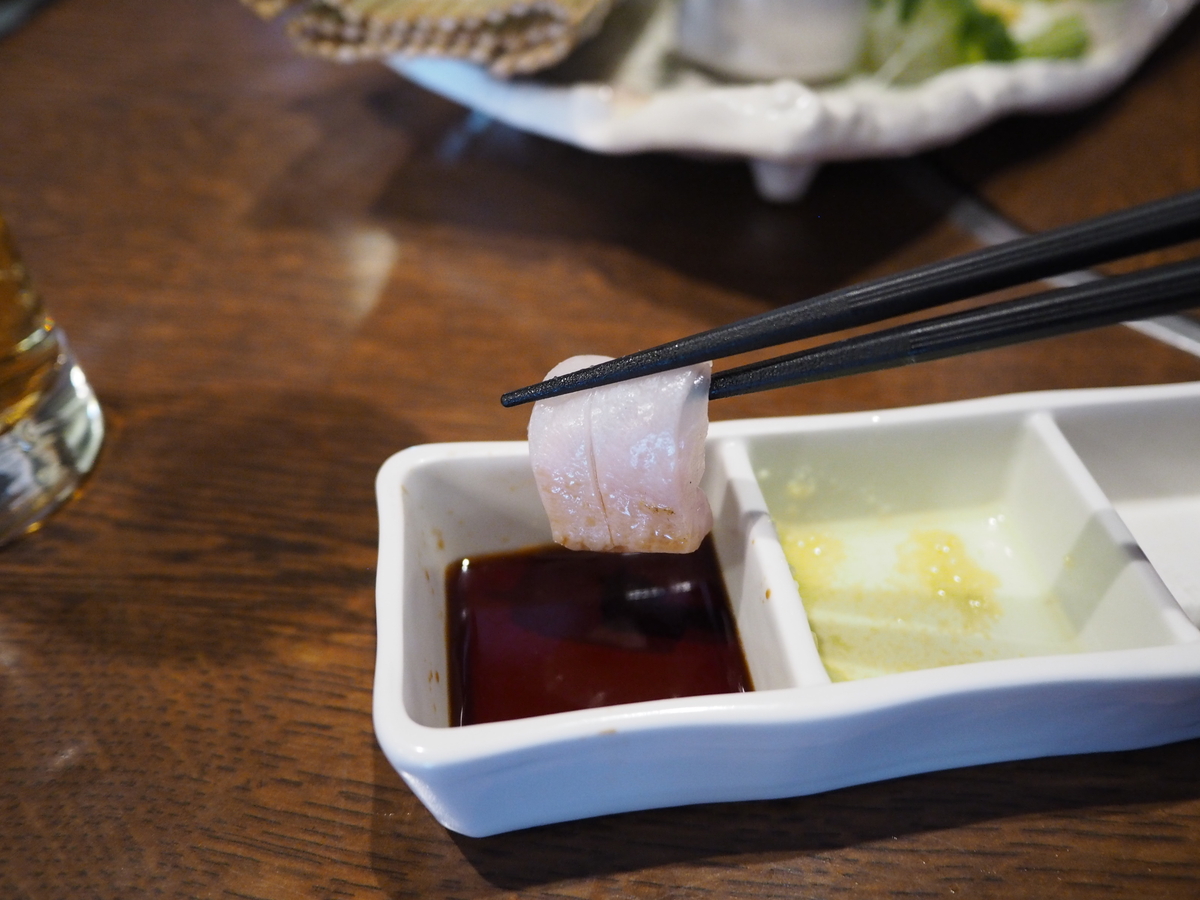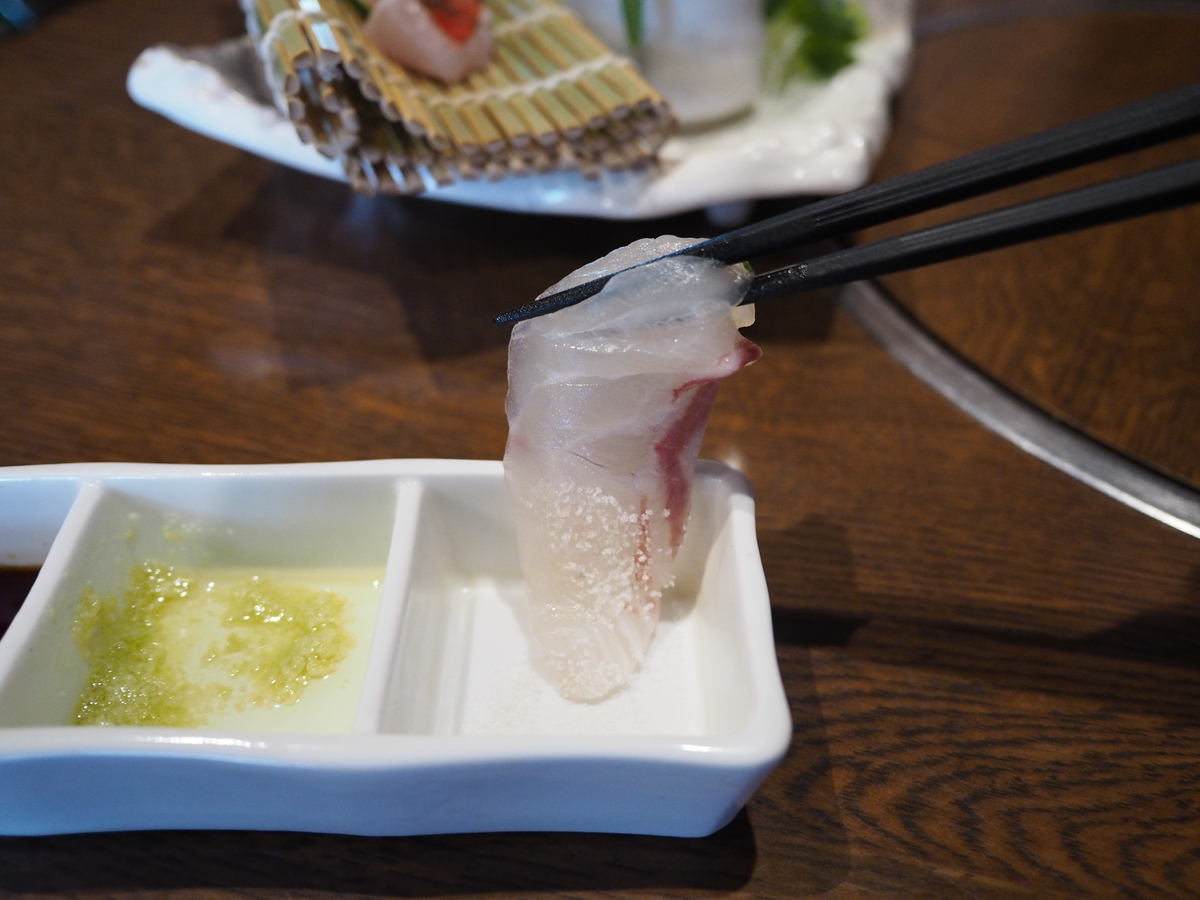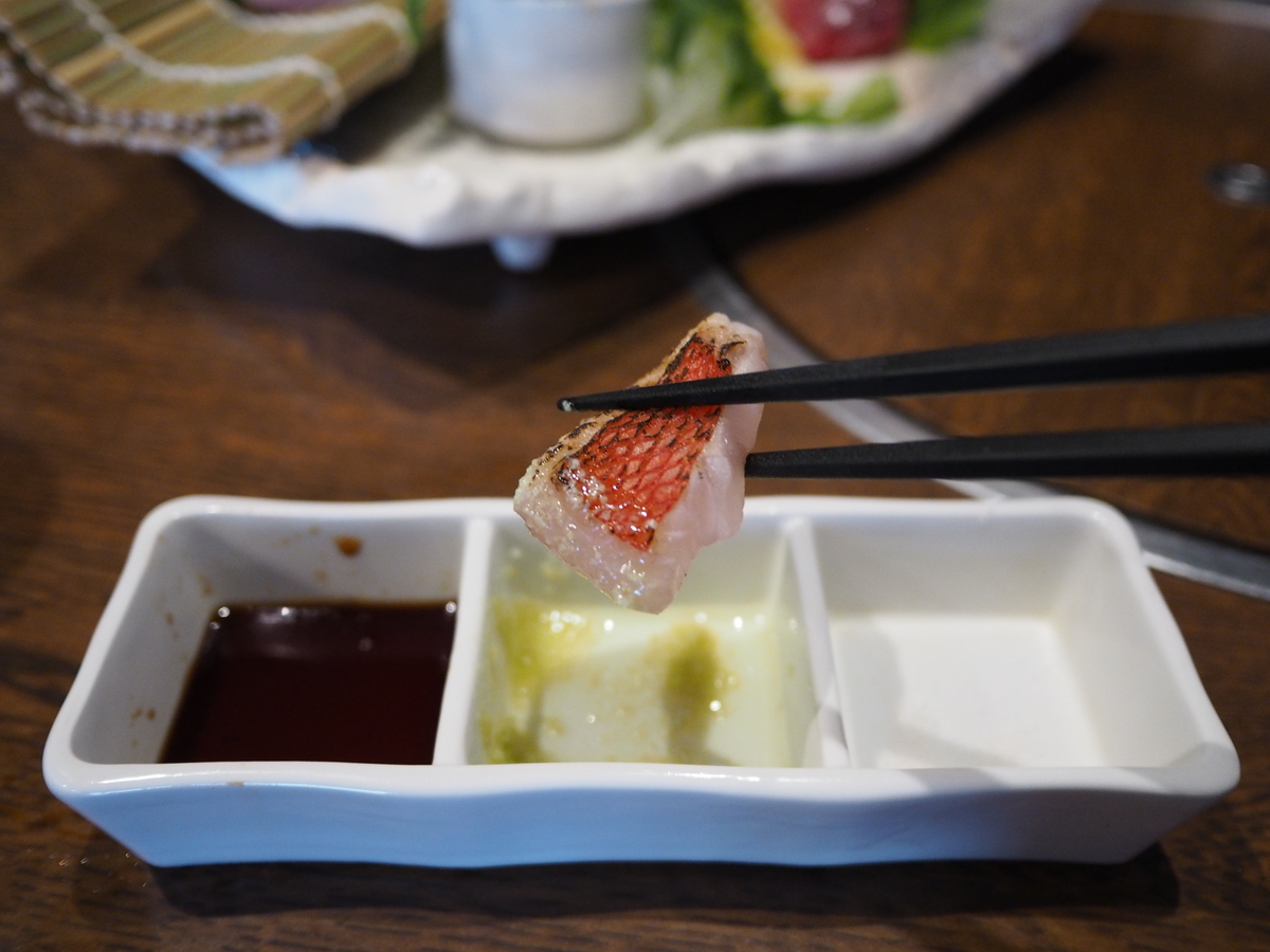 自家製醤油、枝豆のジェノベーゼ、藻塩につけていただきます。