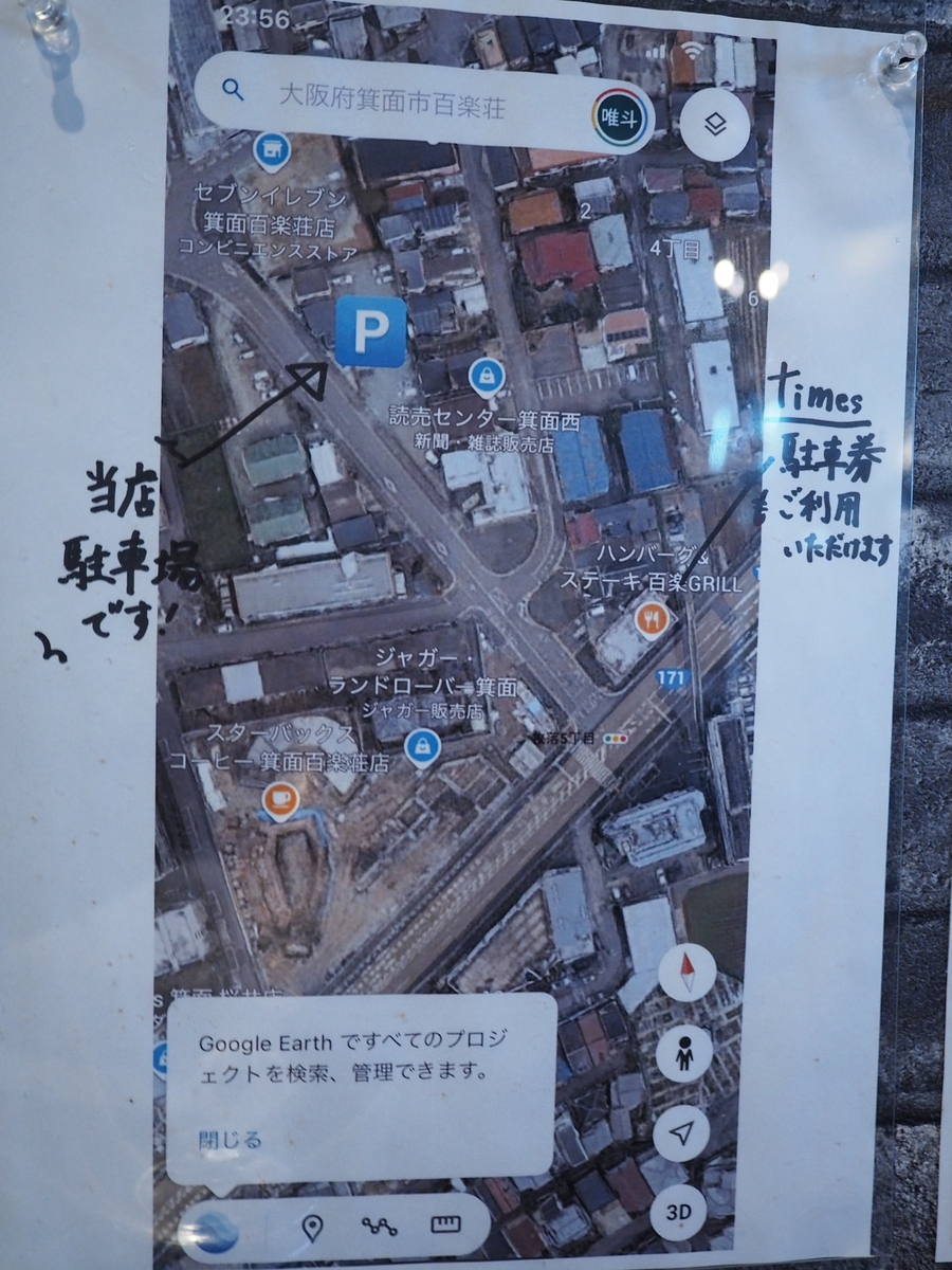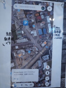 お店の横の道を50Mほど北へ行ったところのモータープル内に4台分の駐車場が用意されています。