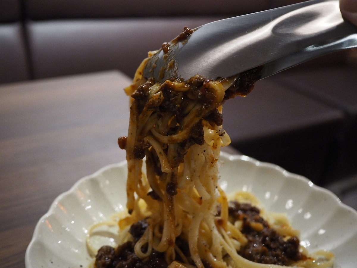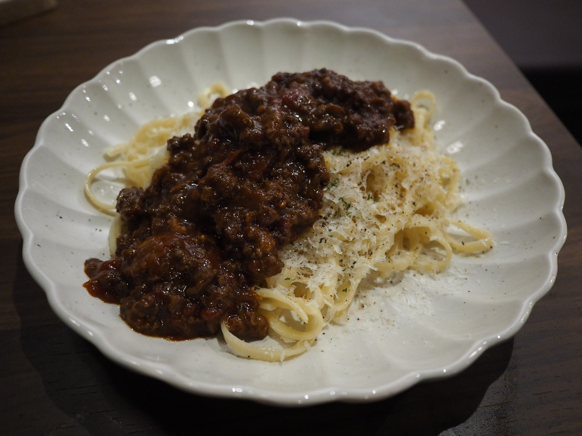 腰のある平打ちパスタに旨味が凝縮した大人の味わいのミートソースが絡みまくってめちゃくちゃ旨い!