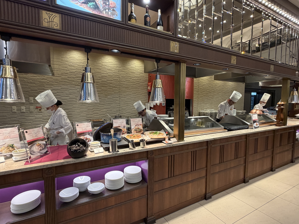 美味しそうな料理がずらりと並び、ライブキッチンでは目の前で料理を仕上げてご提供くださいます!