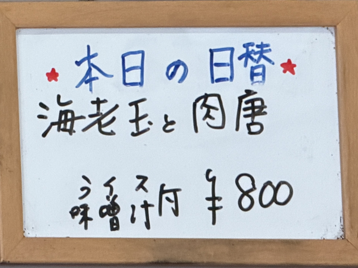 ハンバーグ系が食べたかったのですが無いと言われ、メニューを絞っているのかメニューを出してもらえなかったので他に何があるのか分からず、女将さんがこのメニューをちらっと見て「日替わりにしといて~」オーラが強すぎてそれに耐えきれず、他の常連さん全員が注文していたこの日替わりを注文。