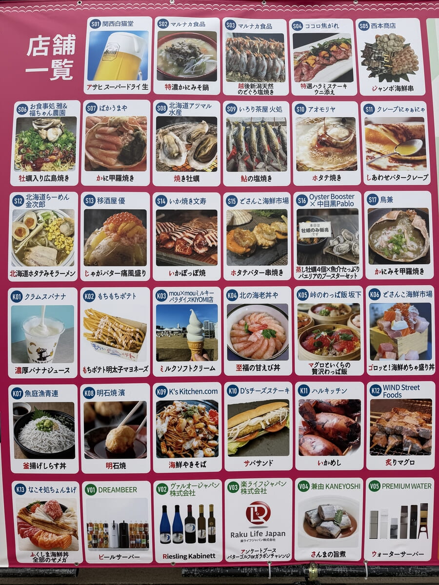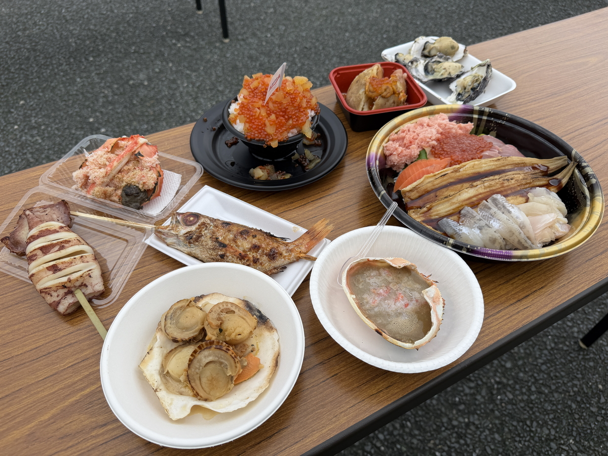 お祭り広場にたくさんのお店が並び、魅力的すぎる魚介料理が多数販売されています!