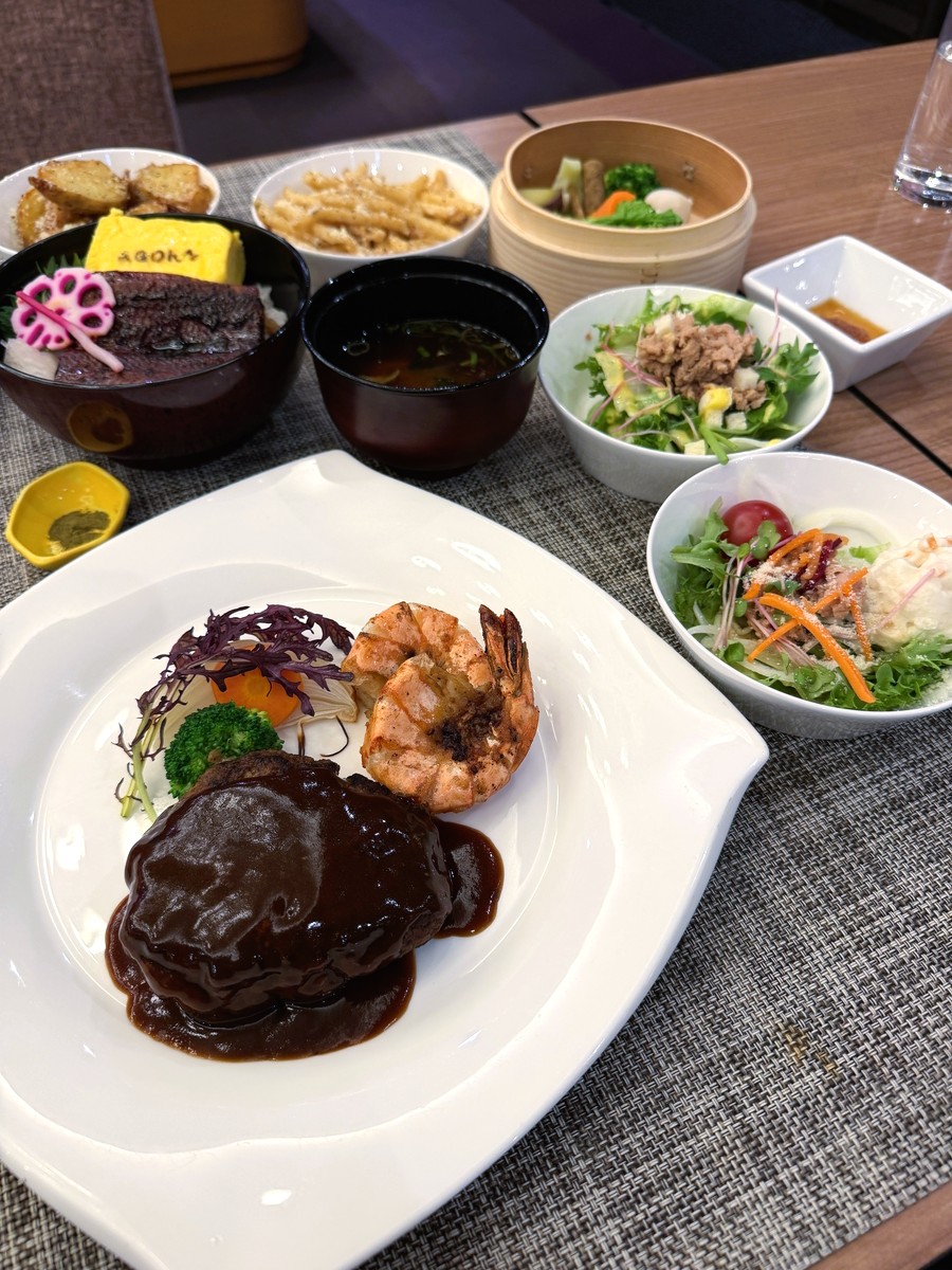 メイン料理は「牛ハンバーグとガーリックシュリンプ」(6,000円税込)と、「鰻丼(赤出汁付き)」(5,000円税込)を選択!