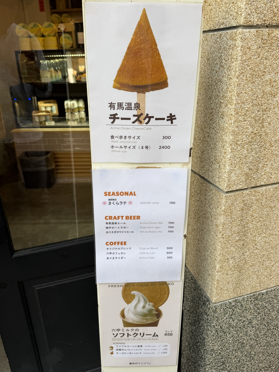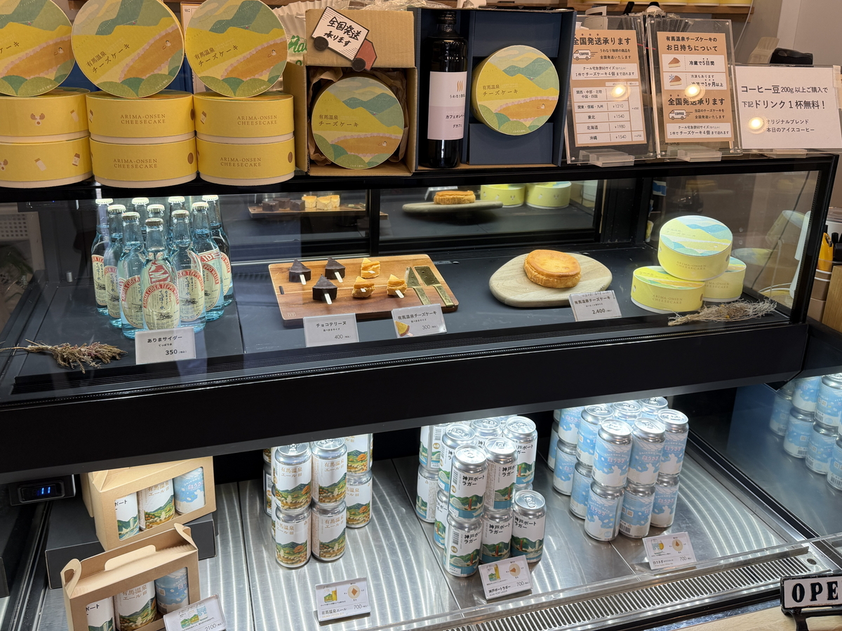 食べ歩きサイズのチーズケーキと、持ち帰りのホールのチーズケーキ、六甲カフェオレやありまサイダーや地ビールも販売されています。
