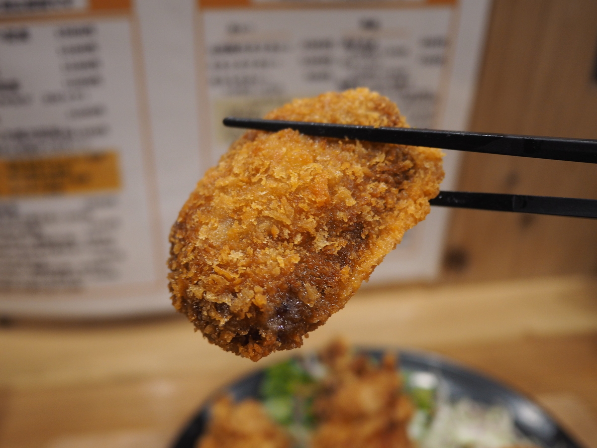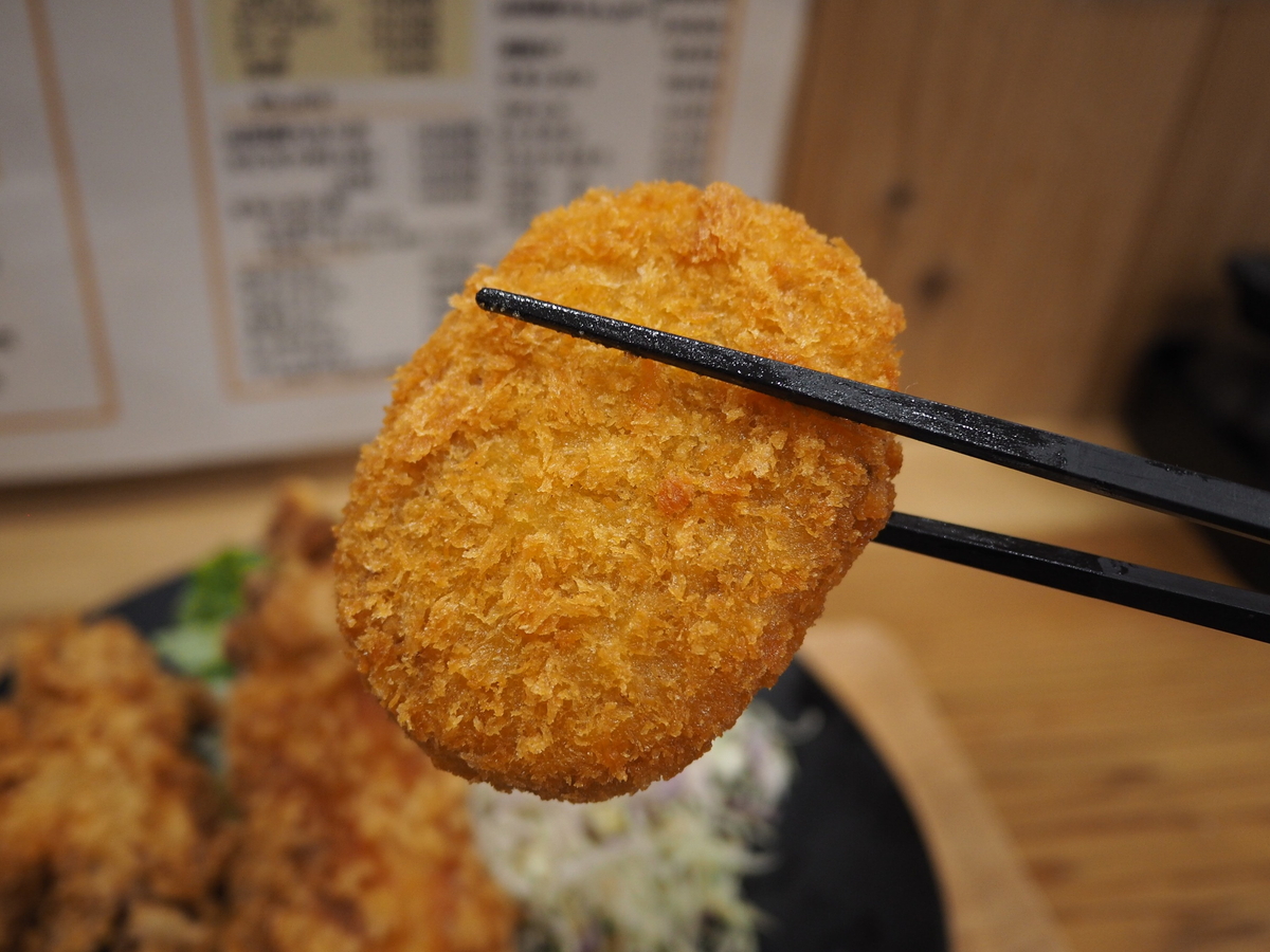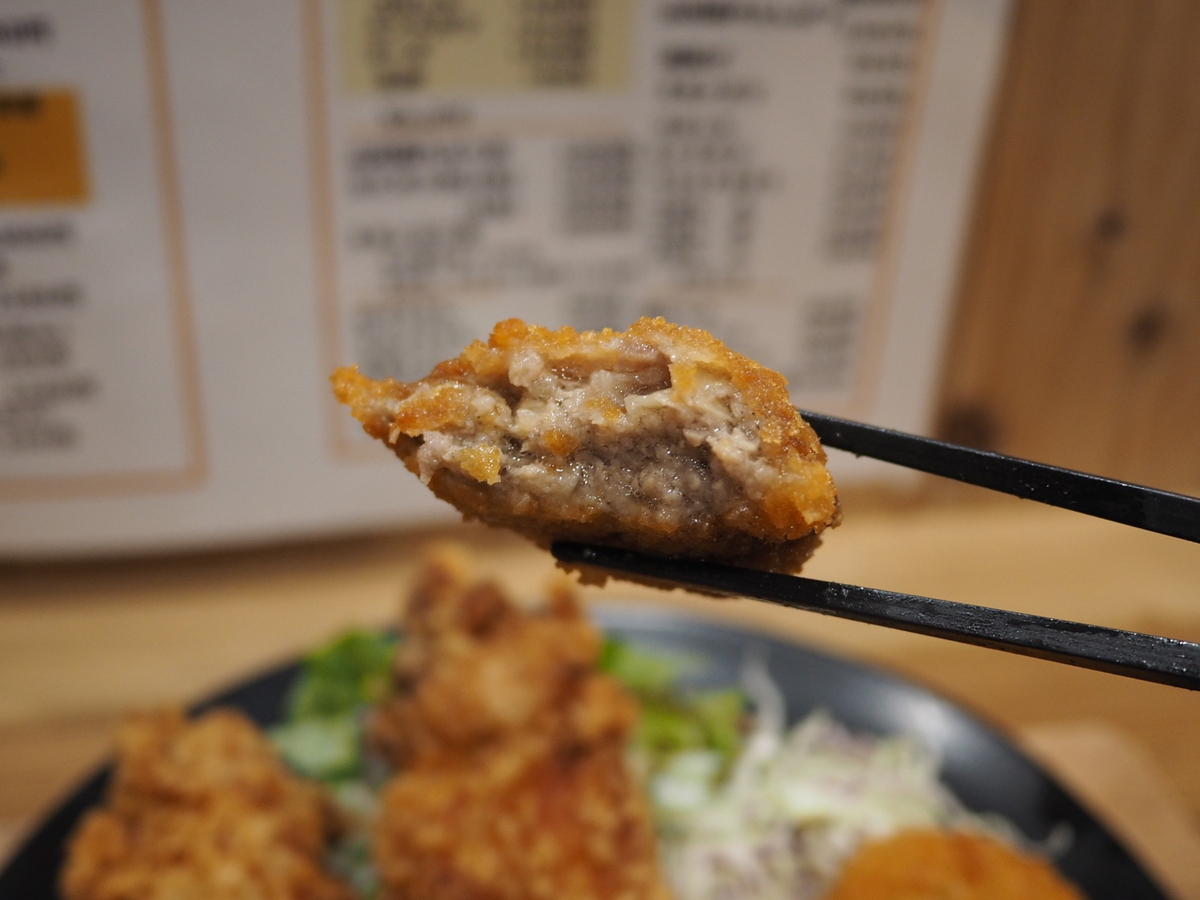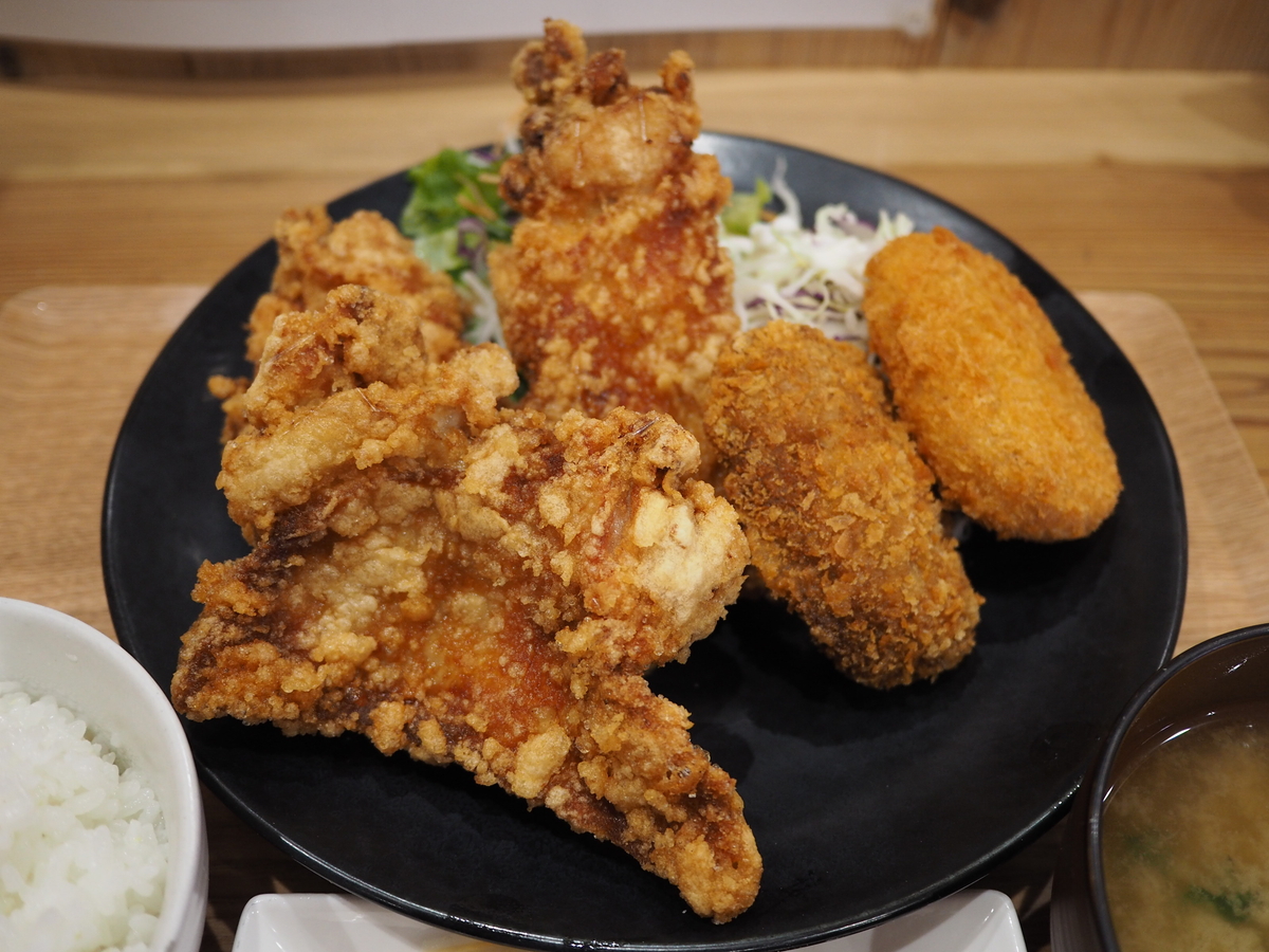 - 大人の握りこぶしより大きな唐揚げが3個、ミンチカツ、コロッケ、野菜サラダが添えられてすさまじいボリュームです!