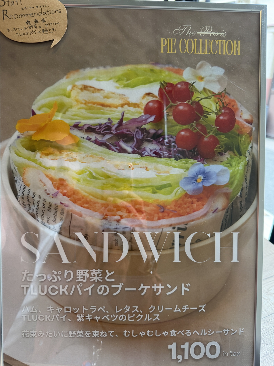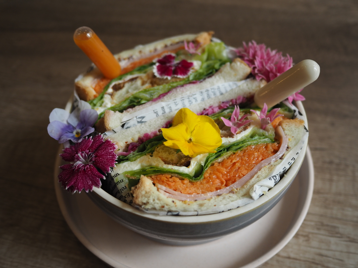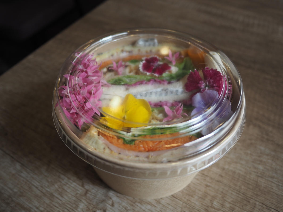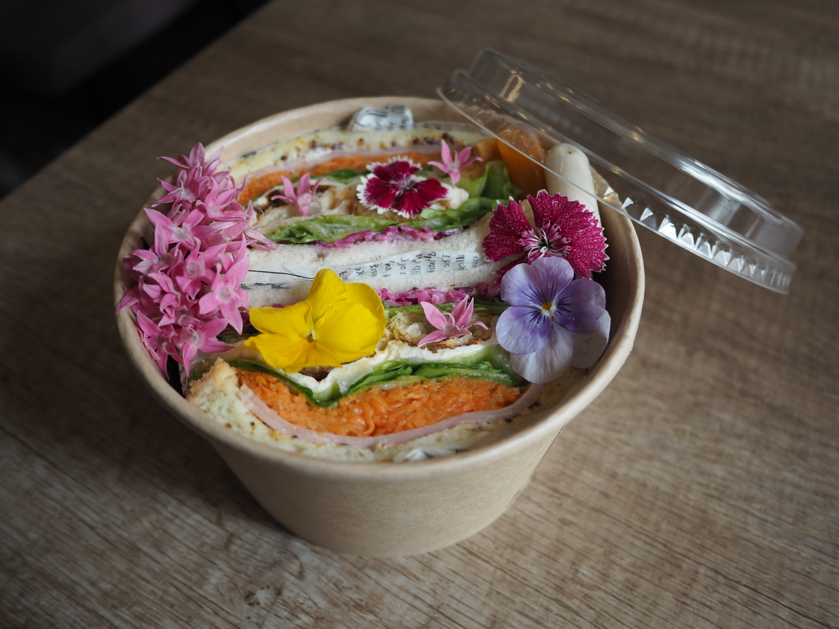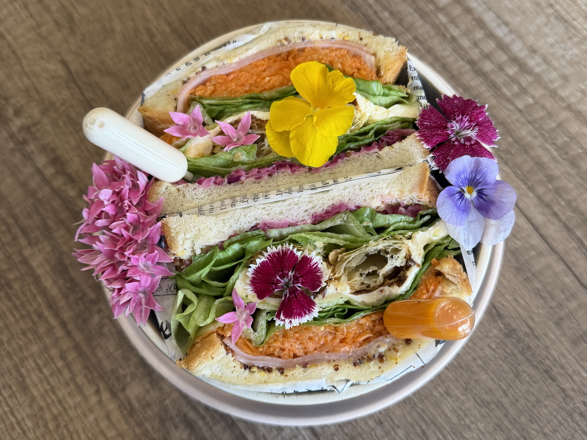 ハム、キャロットラぺ、レタス、クリームチーズ、紫キャベツのピクルス、そして店内で焼き上げられた自慢のパイがサンドされ、エディブルフラワー(食用花)がちりばめられた、あまりにも美しくて悩ましいブーケサンドです!