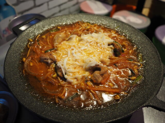 丼のご飯の上に、タレ焼肉とホルモン焼きとキムチとキャベツの千切りが乗っています!